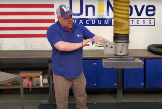 Our high air flow vacuum system works great for stone, which is generally a porous load. Our filter elements are High Efficient paper rated at 10 microns, and are 99.4% efficient in removing particles down to 1 micron. This is ideal in capturing dust particles and preventing damage to the power unit.